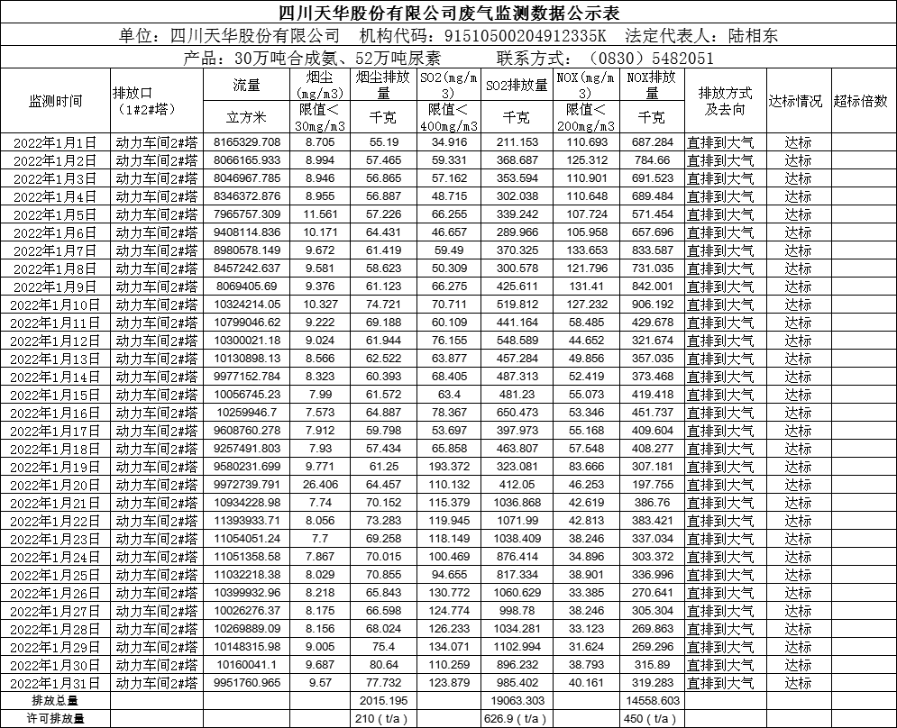 四川天華股份有限公司2022年1月廢氣監(jiān)測(cè)公示
